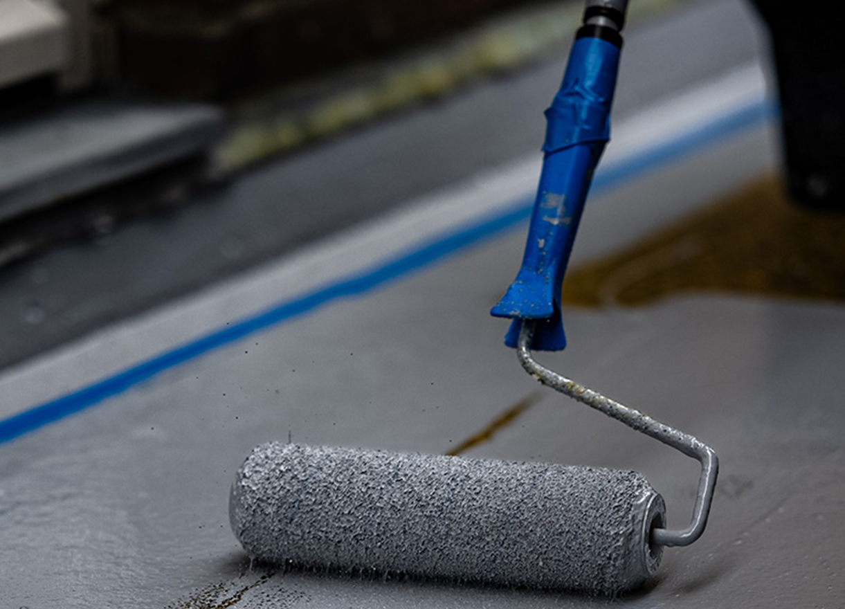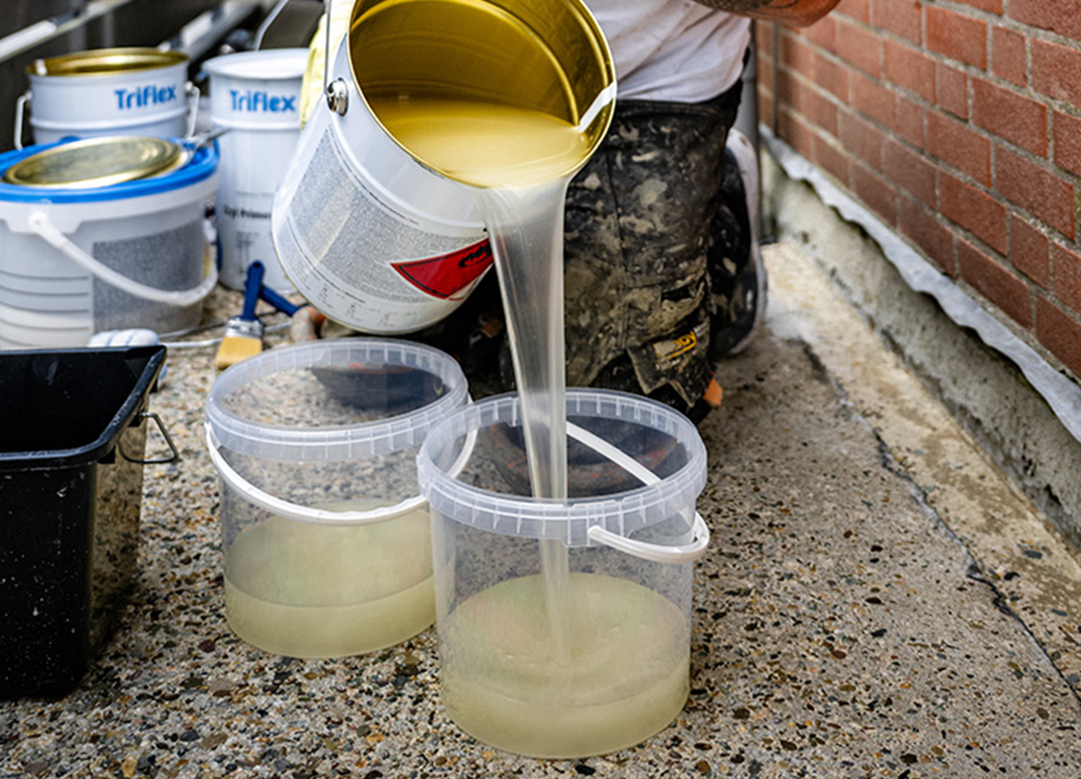 Erkend Triflex verwerker Plooy Allround Betonreparatie ging aan de slag om de galerijen te renoveren. Ze begonnen met het reinigen en schuren van de bestaande ondergrond, waar vervolgens een Triflex Primer met schraaplaag op werd aangebracht om het oppervlak te egaliseren. Daarna werd gefocust op de dilataties, deze werden zorgvuldig afgedicht met het Triflex Cryl R 230 membraan, waardoor ze als flexibele verbindingen konden blijven functioneren zonder dat er risico ontstond op scheurvorming in de nieuwe afwerking. Ook gootzones en schrobranden werden voorzien van een aanvullende beschermlaag in kleur, zodat deze gevoelige onderdelen extra weerstand kregen tegen slijtage en vochtbelasting.