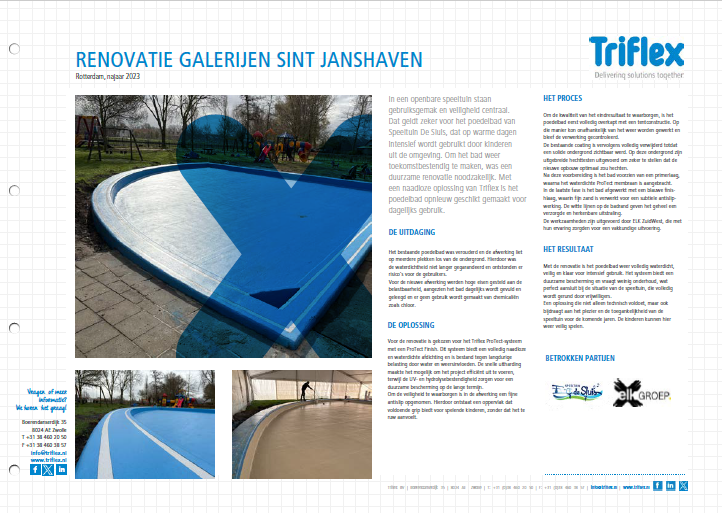Triflex biedt lange termijnoplossingen voor ieder oppervlak. Door jarenlange ervaring weten wij als geen ander welke eisen worden gesteld aan waterafdichtings-, oppervlakte-, en beschermingssystemen. Daarom biedt Triflex alleen hoogwaardige technologische oplossingen. Als gerenommeerd specialist, bieden wij onze klanten alleen de beste service. Wij bieden de oplossingen. Zekerheid tot in detail.