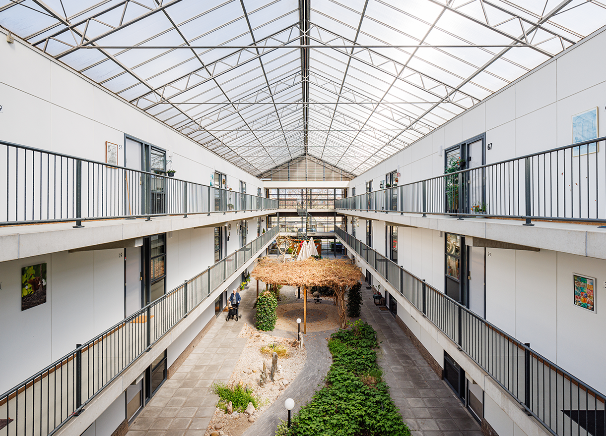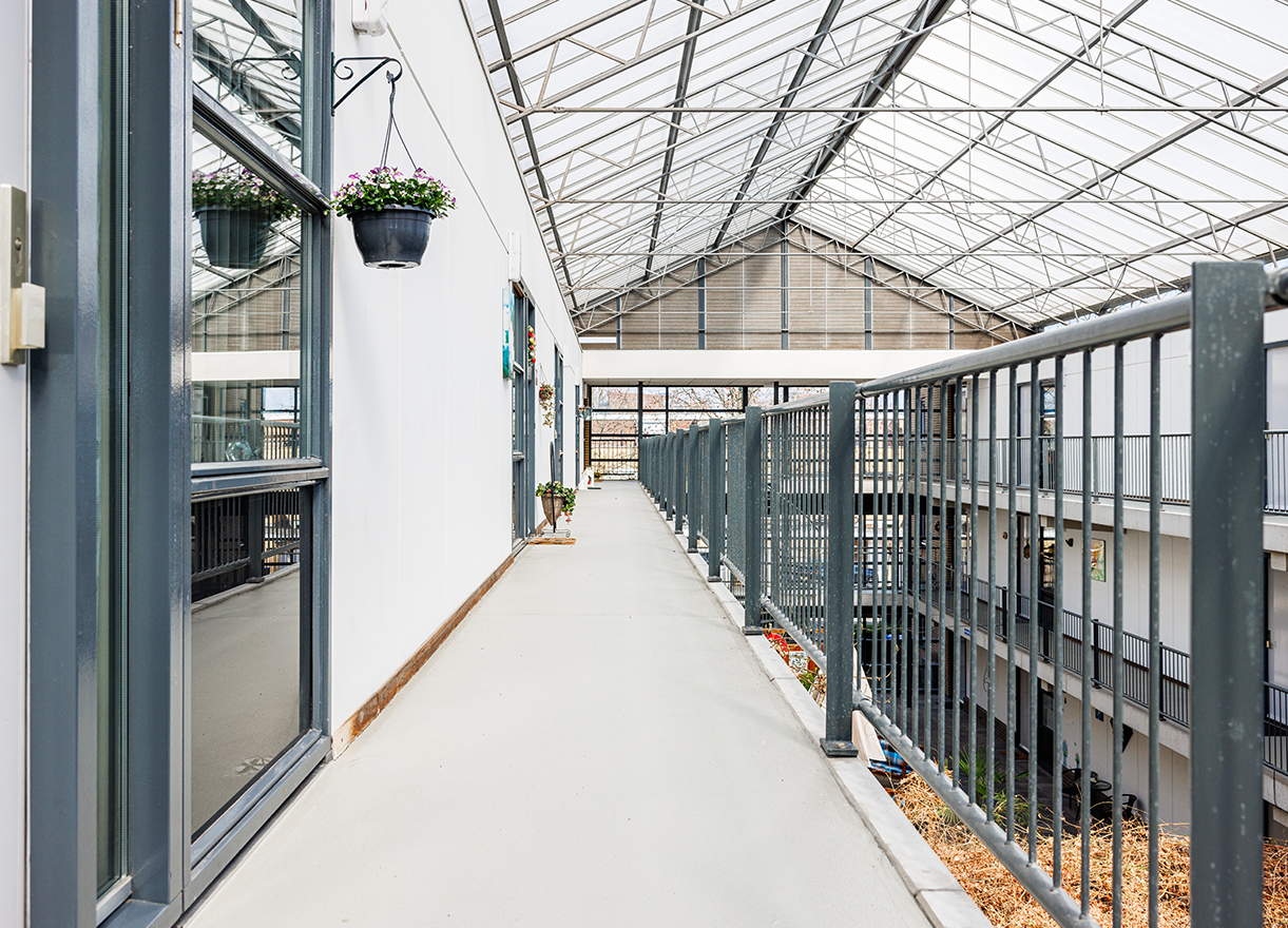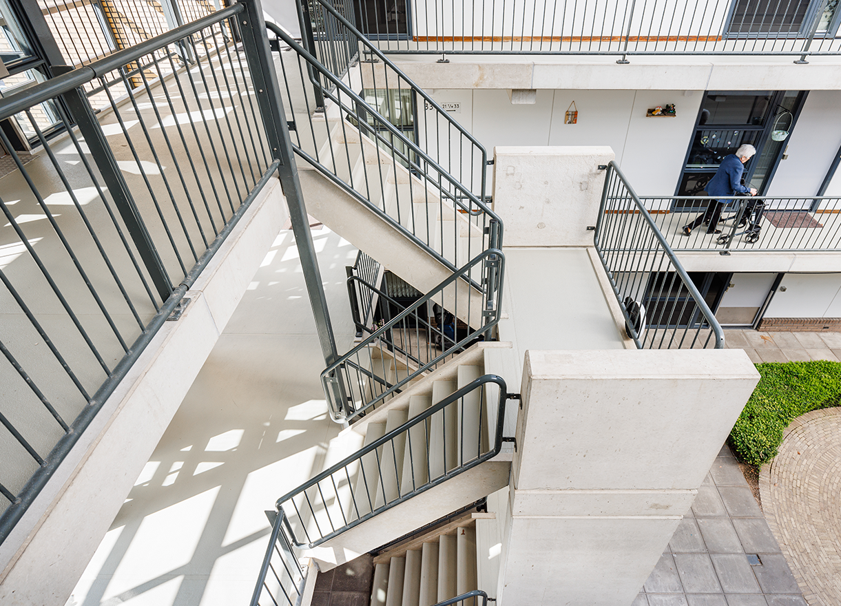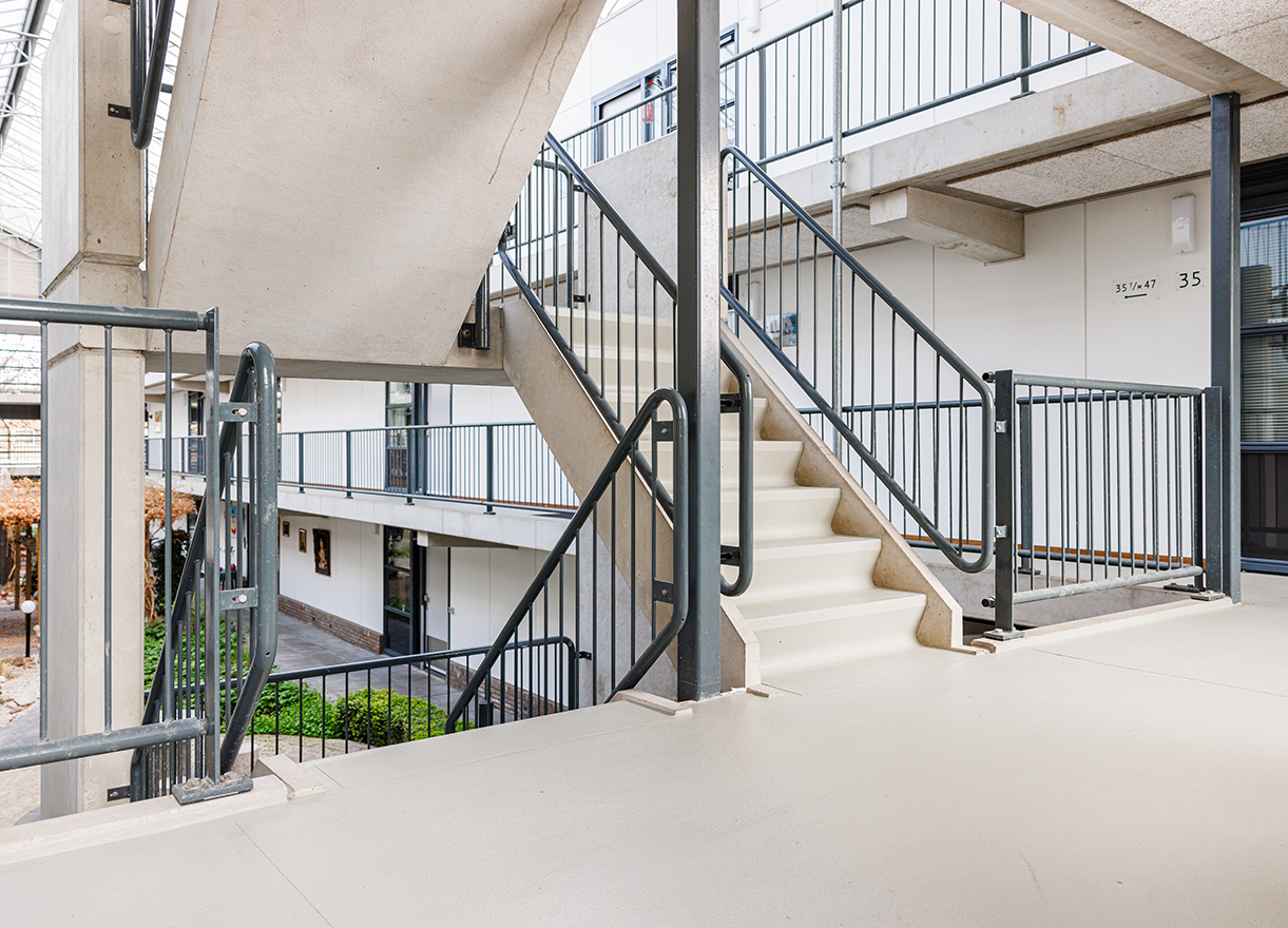In het appartementencomplex was sprake van een verouderde coating welke als glad werd ervaren. Gezien de galerijen en trappen in een atrium zijn gelegen moest extra aandacht besteed worden aan het voorzien van voldoende ventilatie ten tijde van het uithardingsproces van onze producten om zo een zo’n hoog mogelijke kwaliteit te kunnen waarborgen. Ook een goede bereikbaarheid van de woningen ten tijde van de uitvoering was een vereiste.